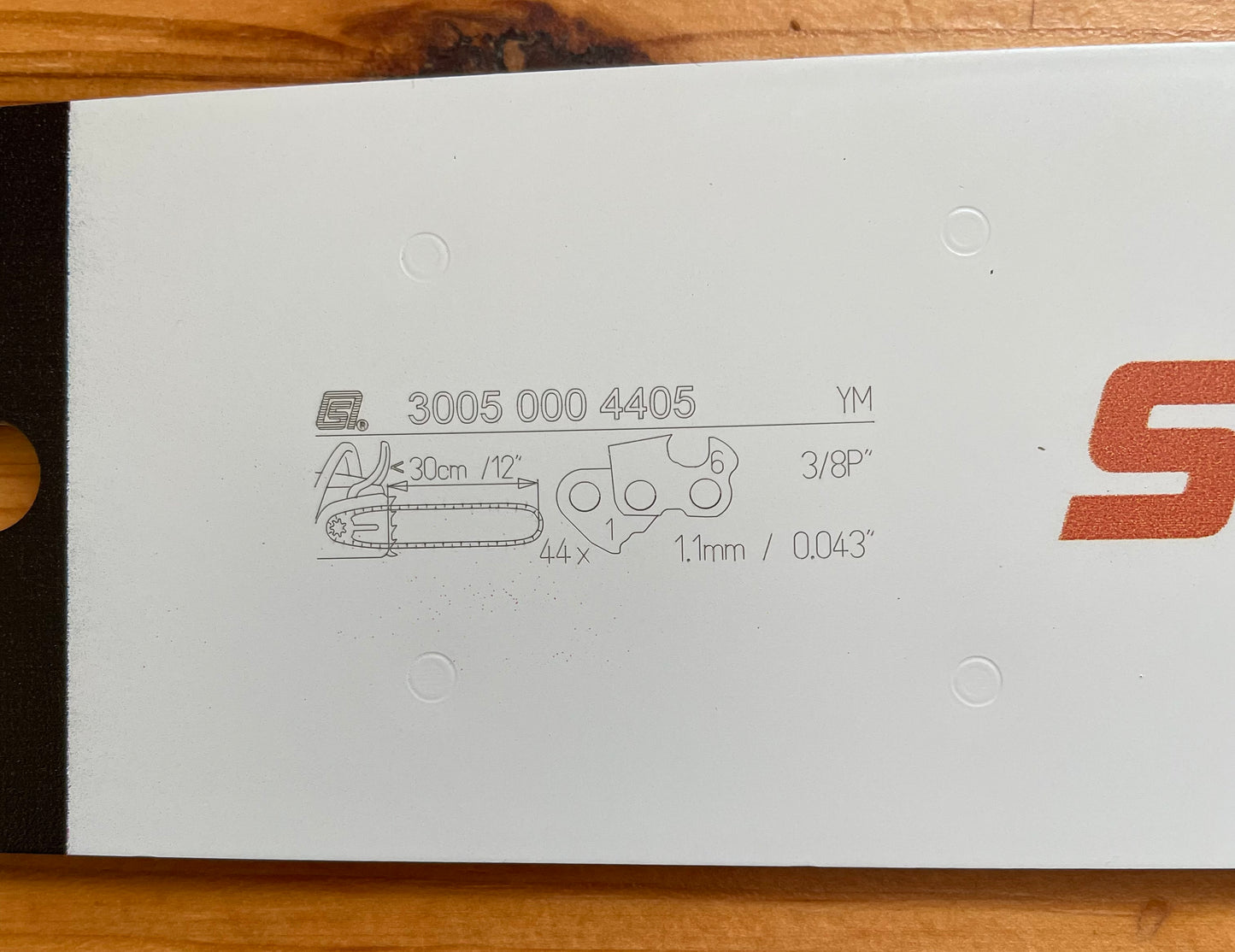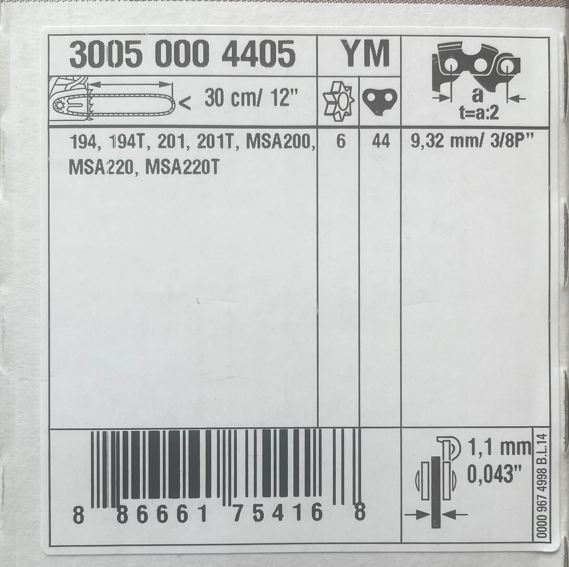 30050004405 uses a 3/8" low profile pitch saw chain, 1.1mm (0.043") with 44 drive links.