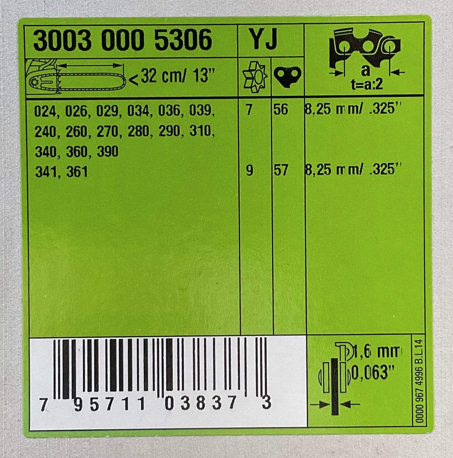 30030005306 uses a 0.325" pitch chain, 1.6mm (0.063") with 56 drive links.